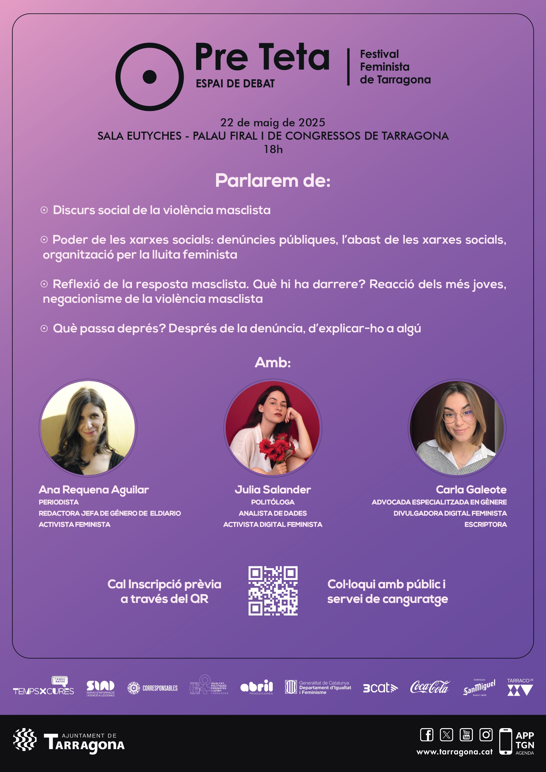 Palau Firal i de Congressos de Tarragona Carrer Arquitecte Rovira, 2, 43001 Tarragona, Tarragona, CatalunyaEl 22 de maig a les 18 hores, a la sala Eutyches del Palau Firal i de Congressos de Tarragona, arribarà l'últim Pre TETA amb la jornada Veus i respostes generacionals construint resistències. El debat comptarà amb la participació de la periodista, escriptora i activista feminista Ana Requena Aguilar, la politòloga, analista de dades i […]