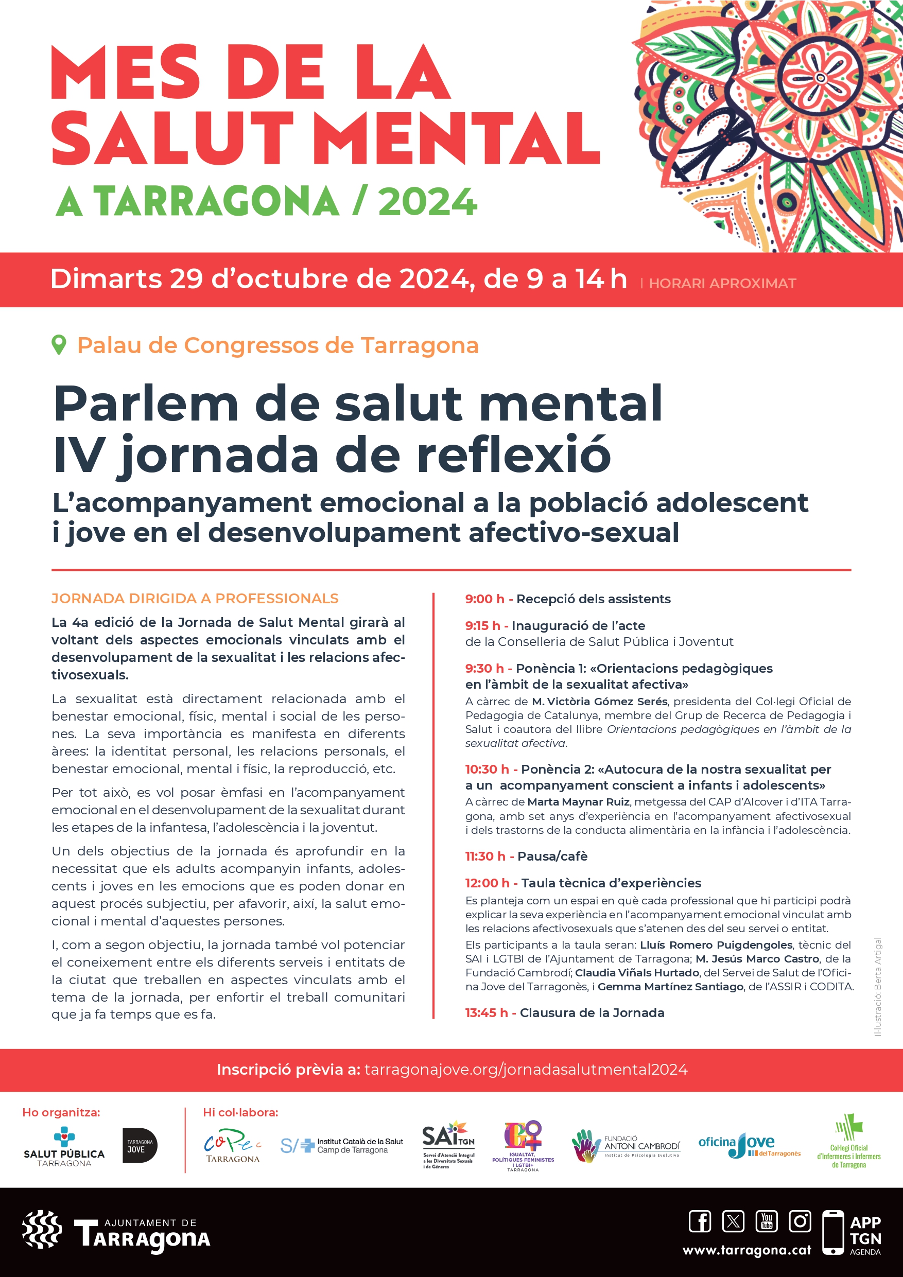 Palau Firal i de Congressos de Tarragona Carrer Arquitecte Rovira, 2, 43001 Tarragona, Tarragona, CatalunyaJornada "L’acompanyament emocional a la població adolescent i jove en el desenvolupament afectivo-sexual" Més informació i inscripcions en aquest enllaç.